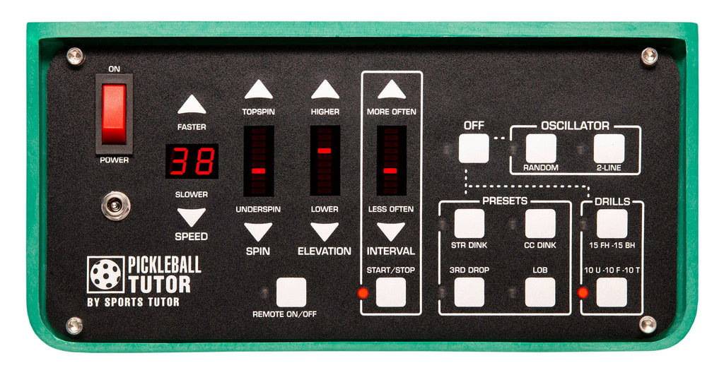 - Two-button Wireless Remote (Included) - Starts and stops ball delivery, and controls side-to-side position of the ball throws.